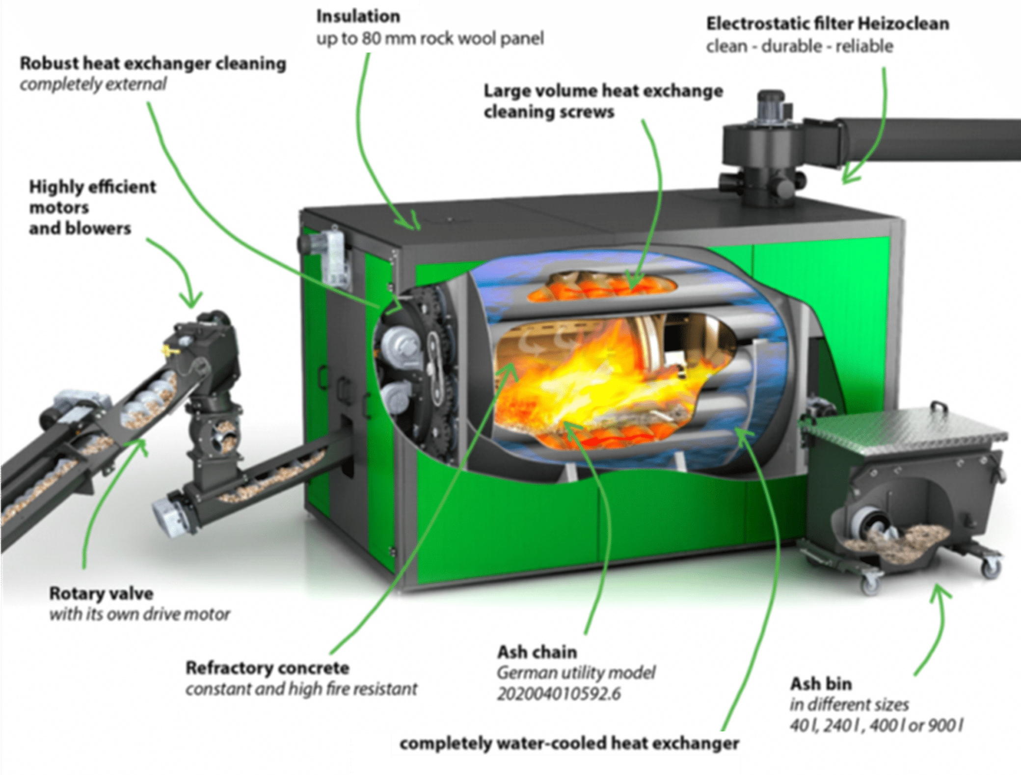 – Multi-Fuel: wood chips, sawdust, shavings, miscanthus, … .